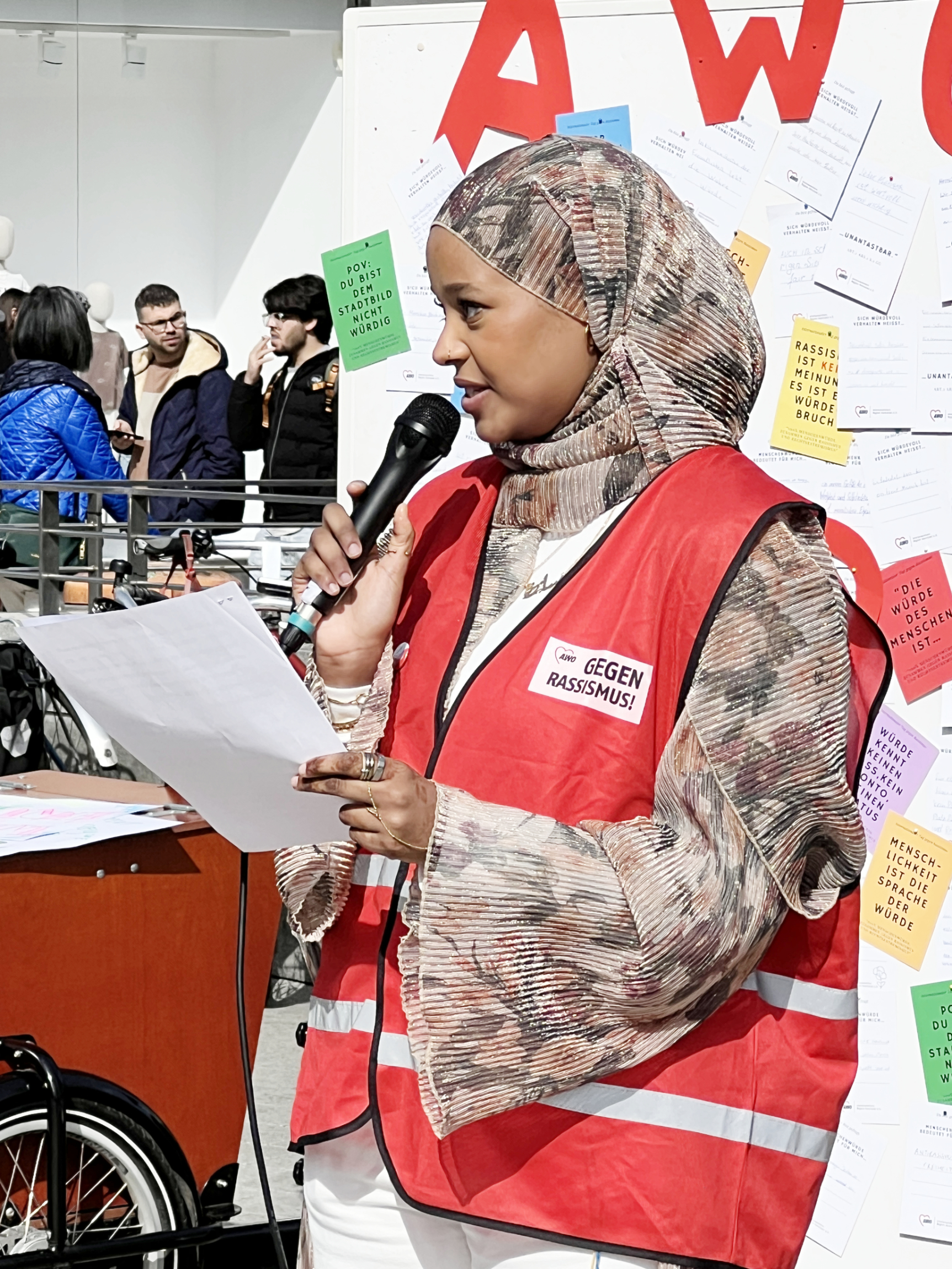 „Antirassismus bedeutet mehr als gute Absichten. Es bedeutet zuzuhören, Verantwortung zu übernehmen, und auch dann etwas zu sagen, wenn es unbequem wird“, sagte Sara Mohammad Burhan, Mitgrationsberaterin bei der AWO Region Hannover e.V., in ihrer Rede. „Solidarität zeigt sich nicht an Tagen wie heute allein. Sie zeigt sich im Alltag: Wenn Erfahrungen ernst genommen werden, auch wenn man sie selbst nicht teilt. Wenn Vielfalt nicht nur akzeptiert, sondern geschützt wird.“