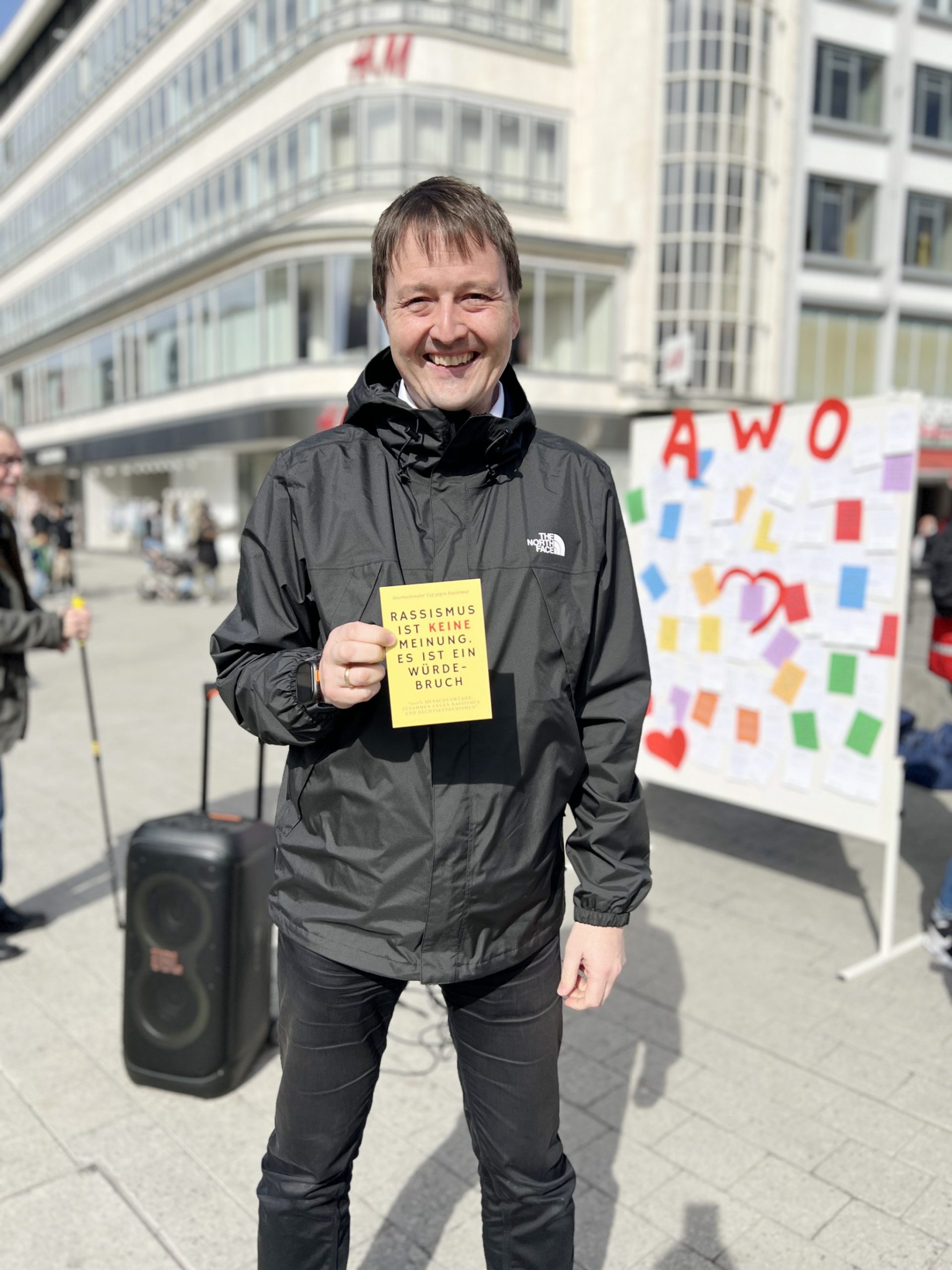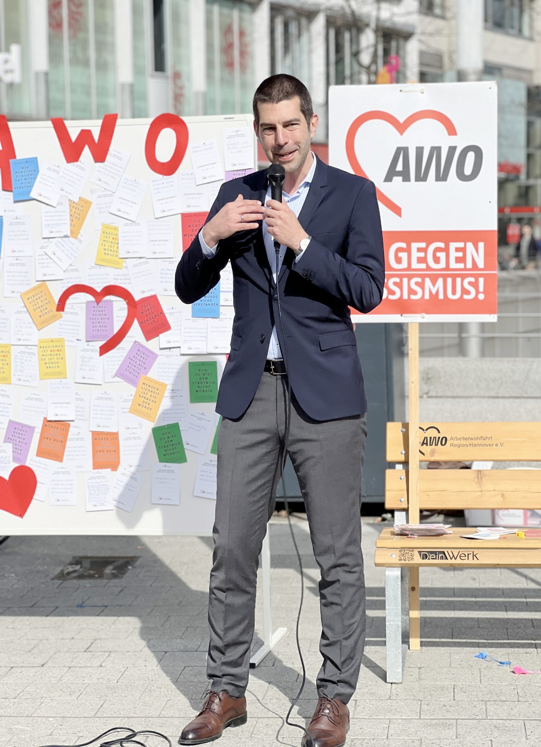 „Die Würde des Menschen ist unantastbar, besagt Artikel 1 unseres Grundgesetzes“, so Marco Brunotte, Vorsitzender des Vorstands AWO Bezirksverband Hannover e.V. „Menschenwürde ist das Fundament unserer Verfassung, unseres Zusammenlebens und gilt für jeden Menschen – ganz gleich welcher Herkunft, Religion oder welchen Geschlechtes. Es ist die Verpflichtung unseres Staates und unserer Gesellschaft alle Menschen gleich zu behandeln und ist der Grundstein für unsere Demokratie. Wir sind das Bollwerk gegen den Faschismus und Menschenfeindlichkeit.“