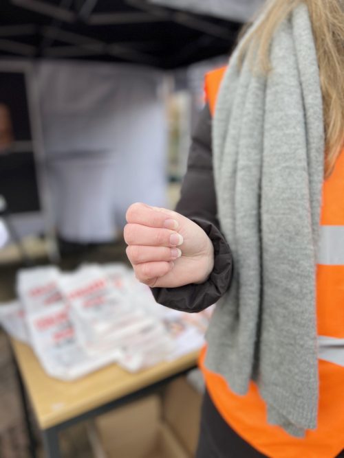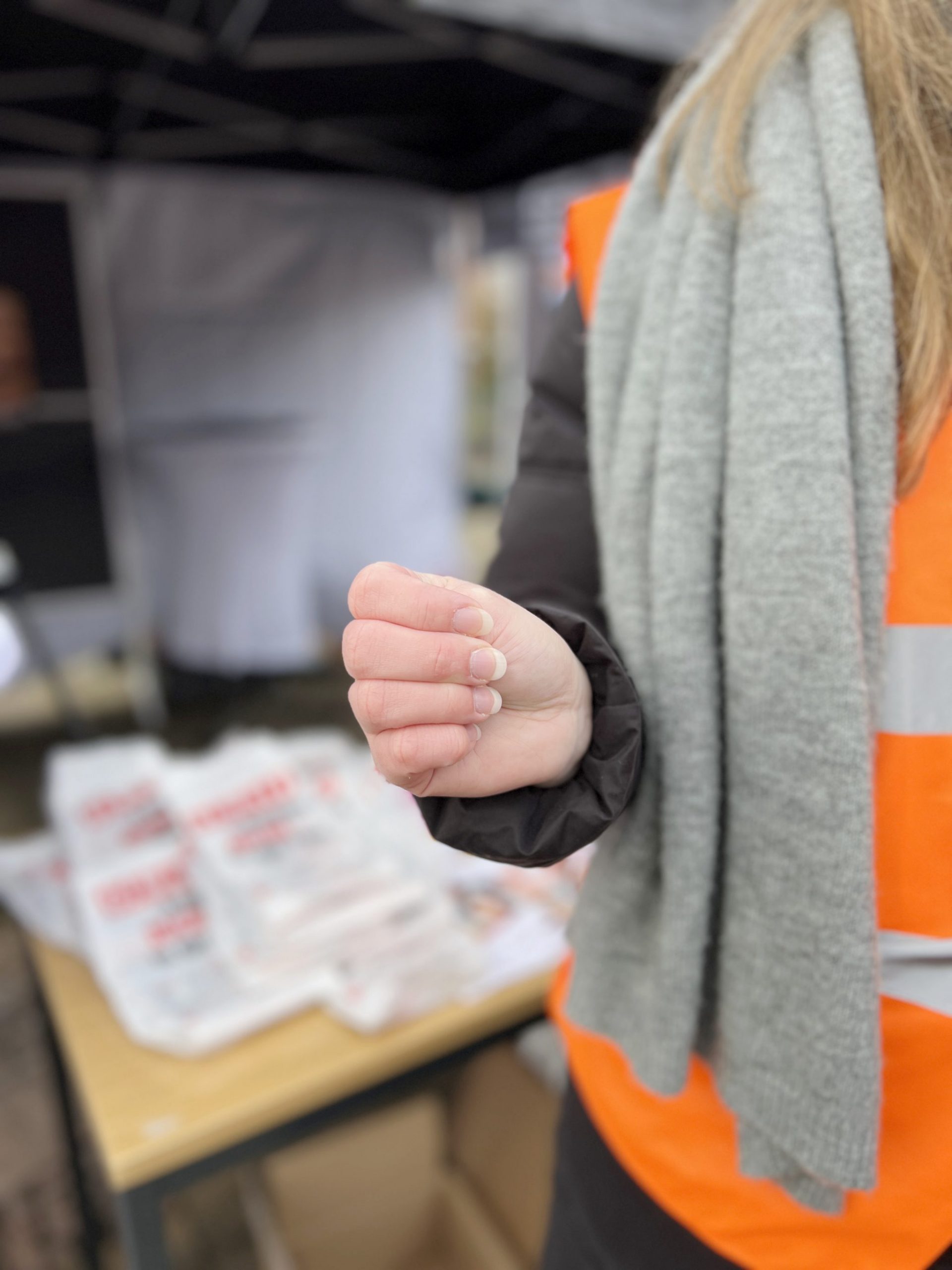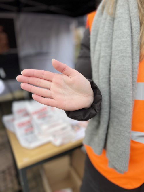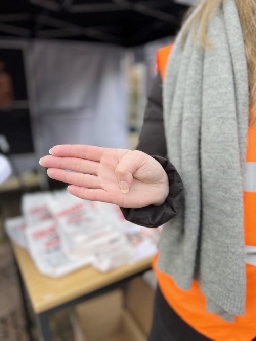 Ein Schwerpunkt des Aktionstags war die Vorstellung des „Signal for Help“, einer einfachen Handgeste, mit der Betroffene unauffällig auf eine Notsituation hinweisen können. Das Zeichen wurde während der Corona-Pandemie entwickelt und funktioniert so: Hand heben, Daumen einklappen, Finger darüber legen. Viele Passantinnen und Passanten fragten gezielt danach, wie dieses Signal funktioniert und wie man reagieren sollte, wenn man es sieht.