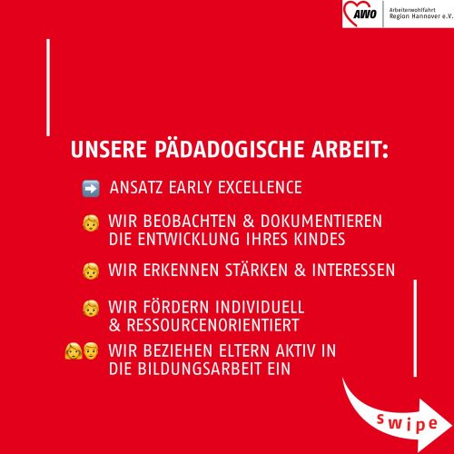 Die AWO-Kita Cecile-Huk-Ring ist eine Regel-Kita und arbeitet nach dem Beobachtungsverfahren Early Excellence. Dabei stehen die individuellen Stärken und Interessen der Kinder im Mittelpunkt. Die pädagogischen Fachkräfte beobachten und dokumentieren die Entwicklung jedes Kindes, fördern ressourcenorientiert und beziehen Eltern aktiv in die Bildungsarbeit ein.