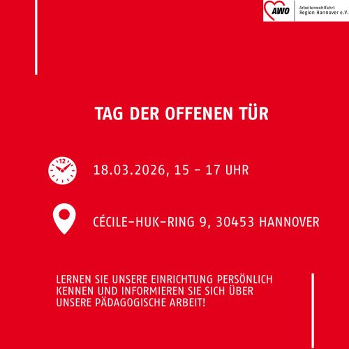 Region Hannover/Hannover. Die AWO-Kita Cécile-Huk-Ring in Hannover bietet zum 01.03.2026 freie Plätze in der Krippe für Kinder im Alter von ein bis drei Jahren sowie zum 01.08.2026 freie Kindergartenplätze für Kinder von drei bis sechs Jahren an. Am 18. März 2026 von 15 bis 17 Uhr lädt die Einrichtung herzlich zu einem Tag der offenen Tür ein. Interessierte Eltern erhalten an diesem Tag einen umfassenden Einblick in die Räumlichkeiten, die pädagogische Konzeption sowie in den Kita-Alltag. Neben einem Rundgang durch die Einrichtung werden das Kinderschutzkonzept, die offene Arbeit sowie die Werte und das Leitbild der Arbeiterwohlfahrt vorgestellt. Darüber hinaus besteht die Möglichkeit, das Team persönlich kennenzulernen und individuelle Fragen zu stellen.