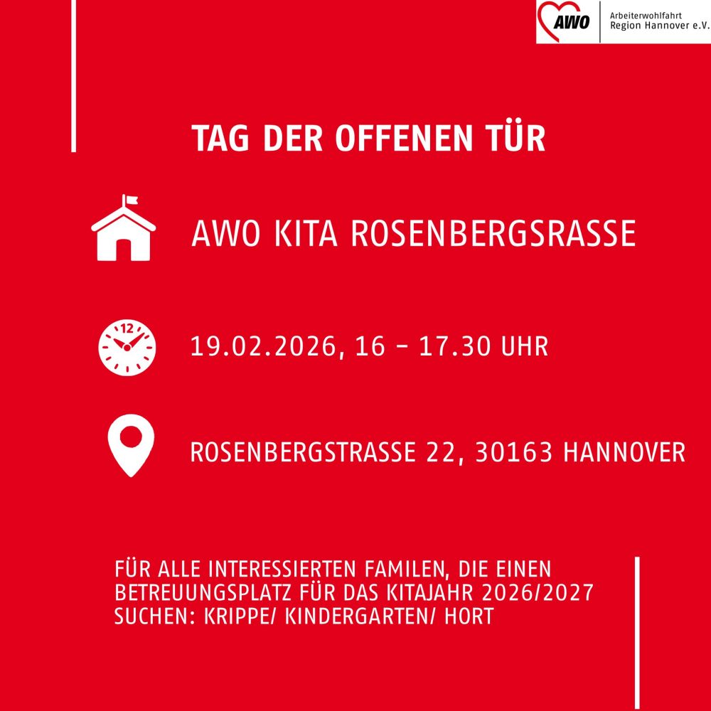 Region Hannover/ Hannover. Die AWO Kita Rosenbergstraße der AWO Region Hannover lädt für Donnerstag, 19. Februar, von 16 bis 17.30 Uhr zu einem Tag der offenen Tür ein. Eingeladen sind alle Familien, die Interesse an einem Betreuungsplatz in der Krippe, im Kindergarten oder im Hort für das kommende Kindergartenjahr haben.