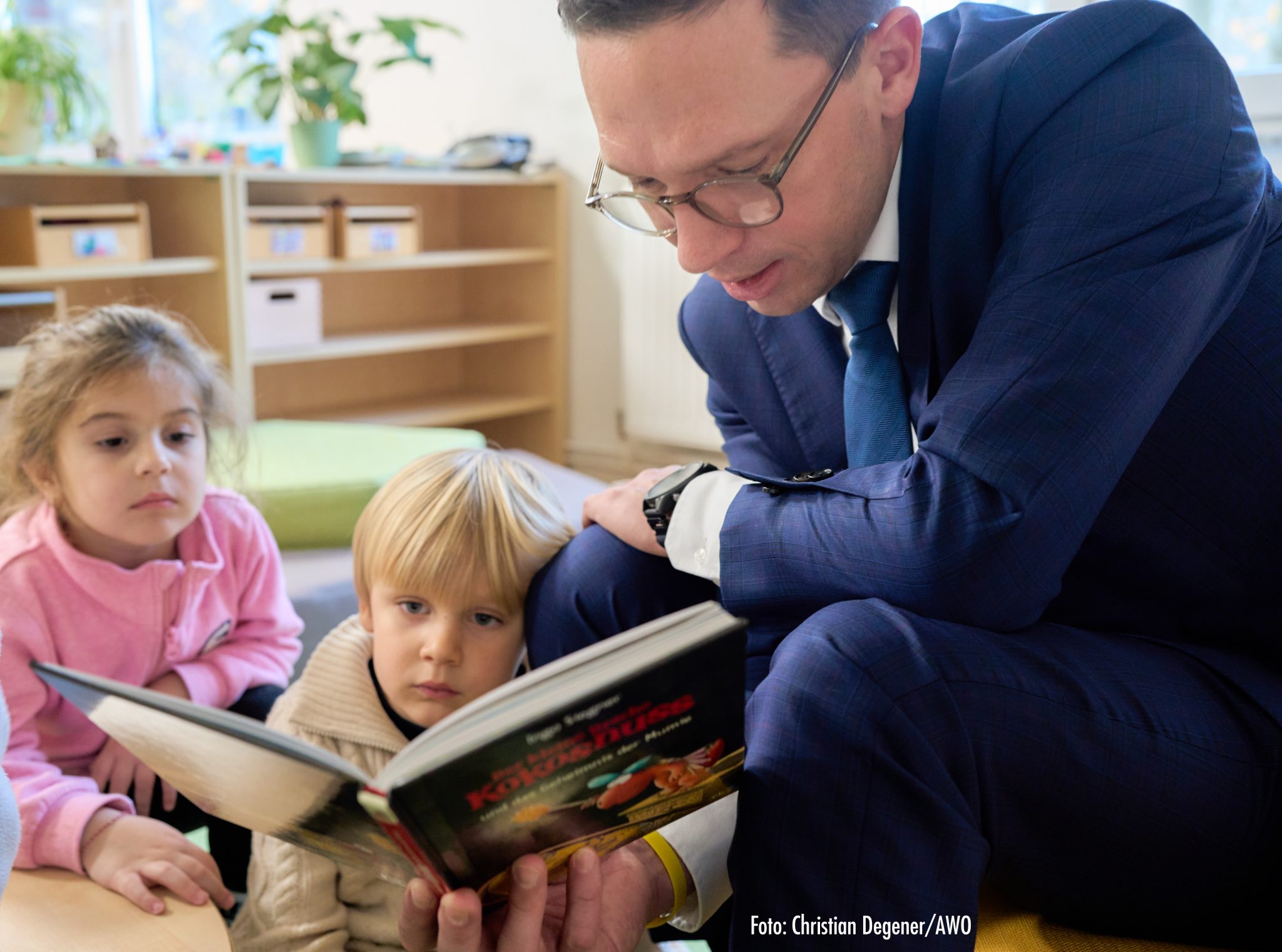 Auch in anderen AWO Kitas wurde der Vorlesetag lebendig: Der niedersächsische Wissenschafts- und Kulturminister Falko Mohrs besuchte die AWO Kita Langenkampstraße und las aus „Der kleine Drache Kokosnuss und das Geheimnis der Mumie“ vor. Die Geschichte führt Kinder auf ein spannendes Abenteuer rund um alte Geheimnisse und Freundschaft – perfekt geeignet, um junge Zuhörer*innen mitzureißen. „So viel Neugier, Staunen und das gemeinsame Eintauchen in fantasievolle Geschichten sind einfach magisch und machen Spaß“, betonte Mohrs nach der Lesestunde.